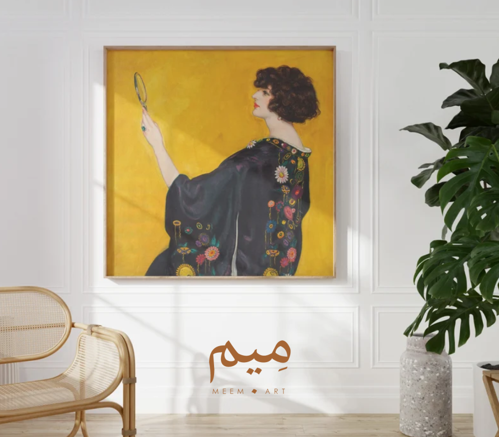أضف لمسة من الفخامة والجمال الكلاسيكي إلى منزلك مع لوحة امرأة, التي تجسد امرأة أنيقة ترتدي الكيمونو الأسود المزخرف بالورود، بينما تتأمل انعكاسها في مرآة صغيرة. بخلفيتها الصفراء المشرقة وتفاصيلها الدقيقة، تمنح هذه اللوحة أي مساحة طابعًا راقيًا يجمع بين البساطة والأناقة الفنية.