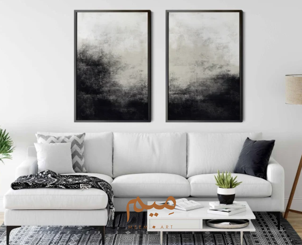 - أضف لمسة من الهدوء والفن العصري إلى منزلك مع لوحتين ضربات فرشاة متداخلة، حيث تمتزج الألوان الفاتحة والداكنة بتناغم جذاب يعكس التوازن والجمال الفني.