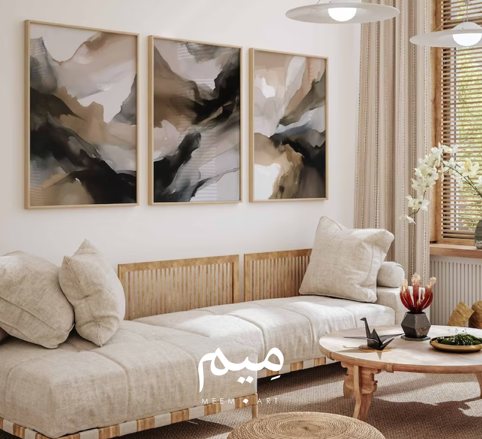 ثلاث لوحات تجريدية تعرض تداخلًا جميلًا بين اللون البني والأسود. تظهر تدرجات الألوان بشكلٍ متناغم وهادئ، مع خلفية بيضاء تضيف للمشهد لمسة من النقاء.