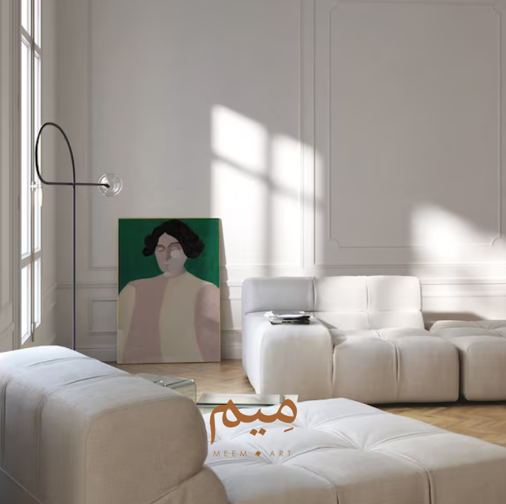 تصوّر اللوحة رسم تجريدي لامرأة ذات شعر أسود وخلفية اللوحة ملونة بلون خضراء ناعم. تتألق الألوان والتفاصيل بشكل متناغم، مما يضفي على اللوحة جاذبية وسحراً فنياً يعكس جمال وأنوثة الإمرأة في تفاصيلها.