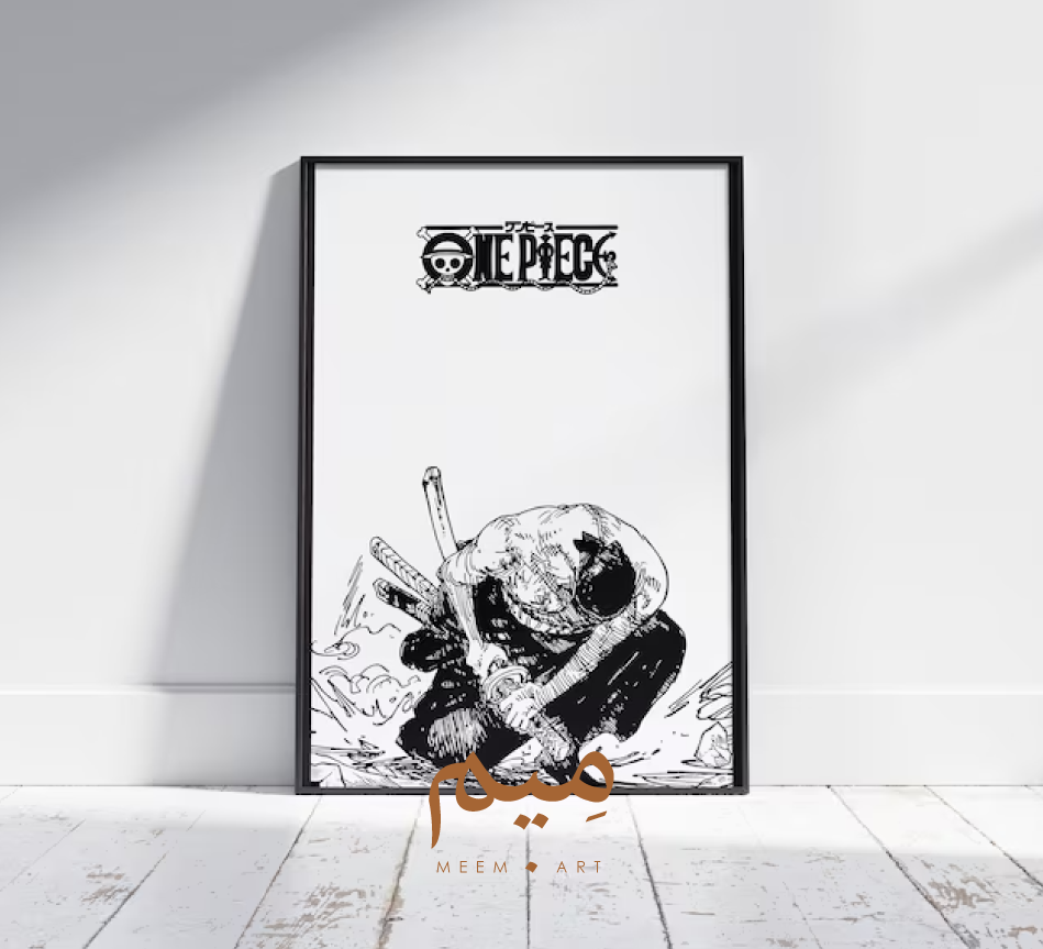 تصوّر اللوحة شخصية زورو من سلسلة الأنمي ون بيس في لحظة يظهر زورو جاثيًا على ركبته بعد أن انتهى من ضرب خصمه بحركة شهيرة.