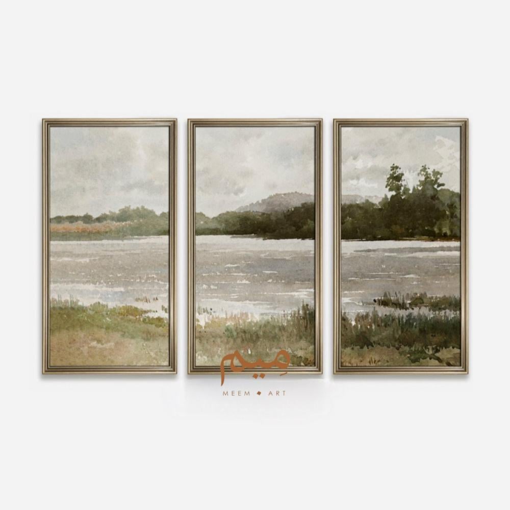 مجموعة من ثلاث لوحات فنتج مجزئة لنهر في وسط الطبيعة ، مما يبعث الطمأنينة. والاسترخاء وسط جمال الطبيعة ،