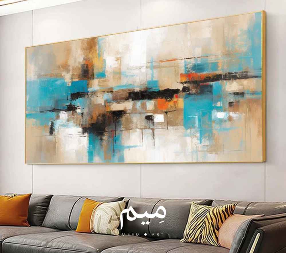 اللوحة تبرز بتداخل متناغم من الألوان والخطوط، حيث تتواجد الأزرق والبيج والأسود والبرتقالي بشكل متناغم على اللوحة. تمزج هذه الألوان بين الانسجام والتنوع، مما يخلق تأثيرًا بصريًا جذابًا ومثيرًا للاهتمام. تعكس اللوحة توازنًا جماليًا بين الألوان المختلفة، مما يجعلها قطعة فنية تثير الفضول وتضفي جوًا مميزًا على المساحة التي توضع فيها.