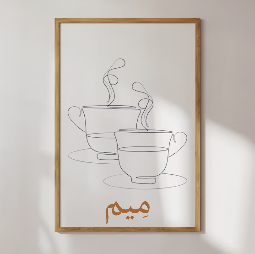 لوحة فنجاني قهوة مرسومين بأسلوب الخطوط السوداء على خلفية بيضاء، مما يخلق تباينًا بين الألوان يبرز جمال التصميم. مما يجعلها إضافة أنيقة لأي مساحة داخلية.