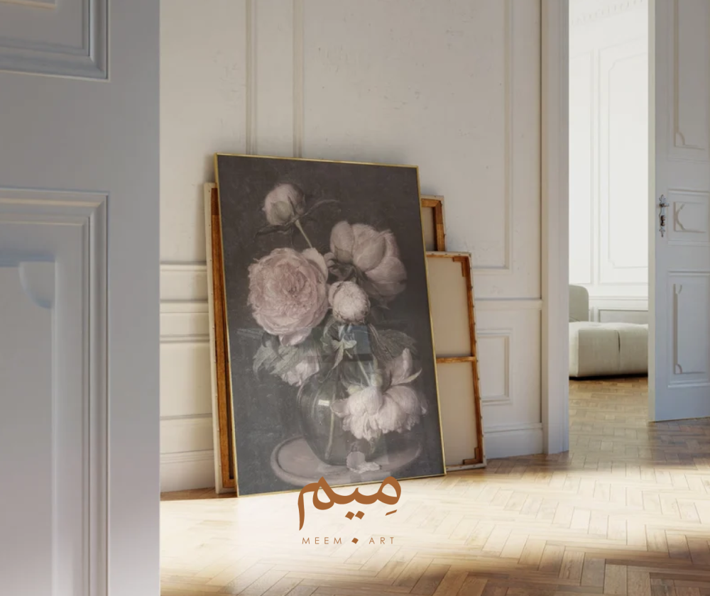 اللوحة فنتج تتميز بخلفية رمادية غامقة وفي الوسط مزهرية زجاجية دائرية شفافة، تظهر بوضوح وتتزين المزهرية بورود وردية زاهية، تناغم مع الخلفية الرمادية، مما يعزز جمال اللوحة ويجذب الانتباه إلى التفاصيل الدقيقة.