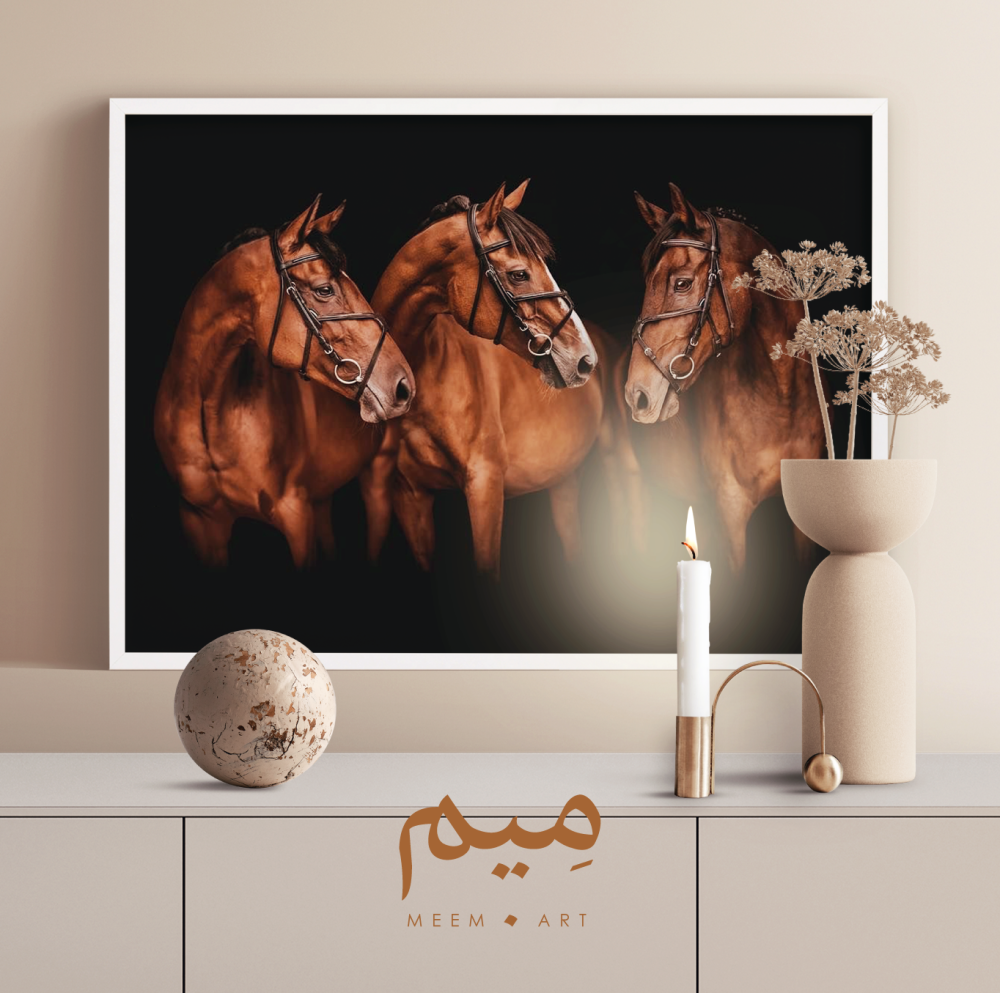 لوحة واقعية تمثل ثلاث خيول بنية بشكل مذهل، حيث تبرز جمالها وقوتها بشكل رائع أمام خلفية سوداء تجعلها تتألق بشكل لافت. هذه اللوحة تضيف لمسة أنيقة وجميلة لأي مكان تعرض فيه، سواء كان في غرفة المعيشة أو المكتب أو الصالة، وتجعل المكان ينبض بالحياة والأناقة.