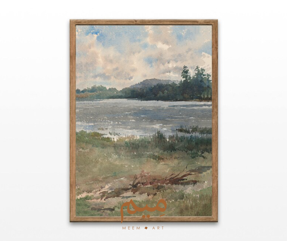 لوحة فنتج تجسد منظرًا طبيعيًا ساحرًا يتمثل في بحيرة هادئة محاطة بأشجار وسهول خضراء. تنعكس جمال الأشجار والسماء الزرقاء الصافية على سطح البحيرة، مما يخلق مشهدًا مذهلاً يدعو إلى الهدوء والاسترخاء.
