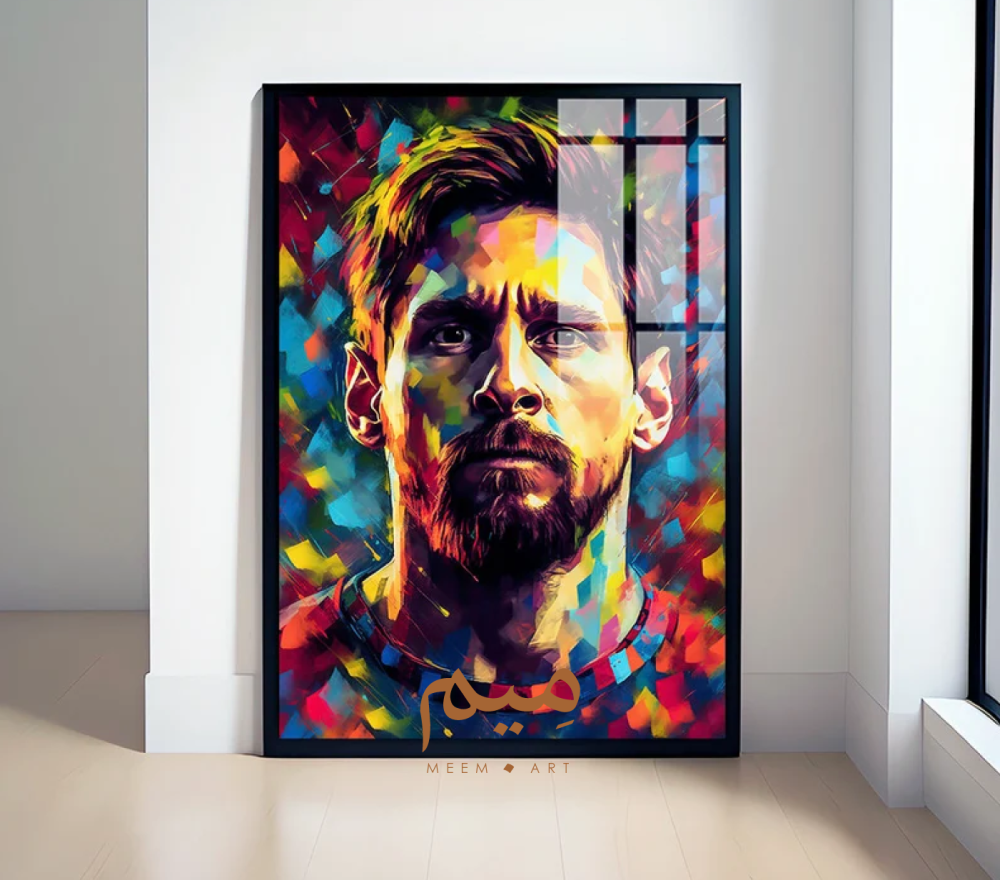 لوحة تجريدية مميزة للاعب ميسي بتأثير ضربات الفرشاة، مع استخدام مجموعة من الألوان. تتميز اللوحة بتفاصيلها الملفتة والمتداخلة بأسلوب فني رائع، مما يجعلها قطعة فنية مميزة تبرز جمال وروعة اللاعب ميسي وتضيف أجواءً من الحماس والإثارة إلى المساحة التي تُعرض فيها