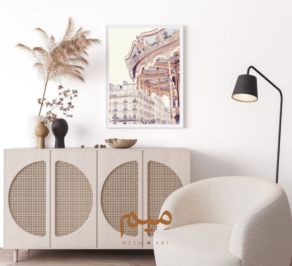 تصوّر اللوحة كاروسيل ملوّن ومزخرف، وتظهر واجهة المباني الباريسية الجميلة في الخلفية، مما يضيف للمشهد جاذبية وجمالًا إضافيًا.