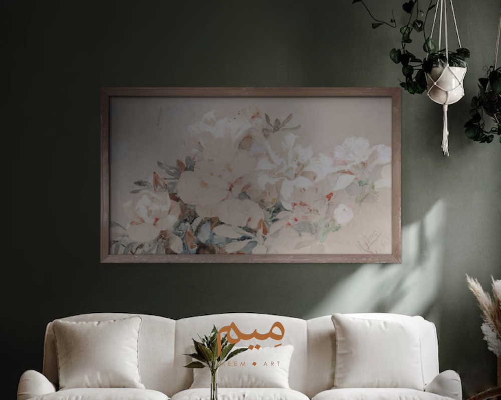 لوحة فنتج خلفية بيج دافئة، وعليها تبرز زهور بيضاء متفتحة وأوراق خضراء تمتد براعمها. ينسجم اللون البيج مع جمال الزهور البيضاء وتفاصيل الأوراق الخضراء، مما يعطي شعورًا بالهدوء والأناقة. تعكس اللوحة جمال الطبيعة بأسلوبها البسيط والجذاب، مما يجعلها قطعة فنية رائعة تضيف لمسة من الجمال لأي مساحة داخلية.
