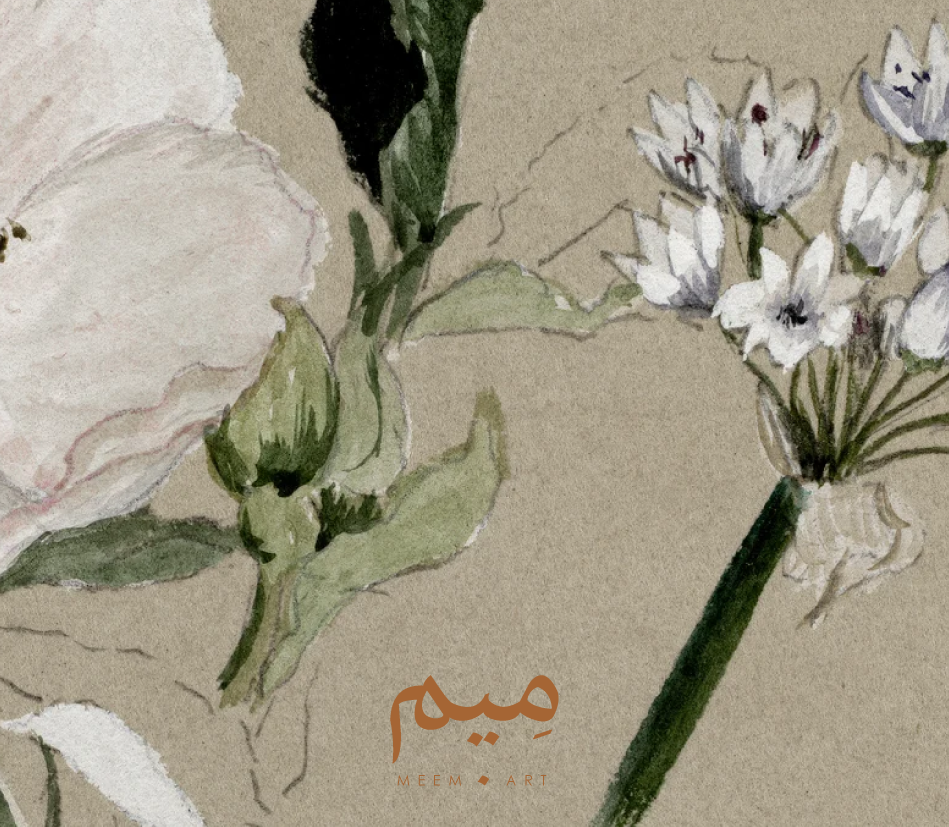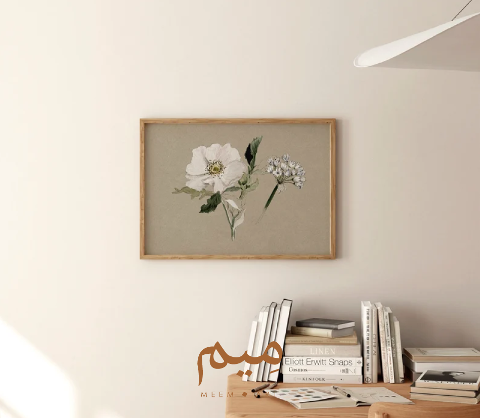 اللوحة تصور زهرة بيضاء مع غصنها الأخضر. مرسومة بتفاصيلها الدقيقة، تبرز الزهرة بجمالها على خلفية بيج، تتباين ألوانها بشكل جميل ومتناغم.